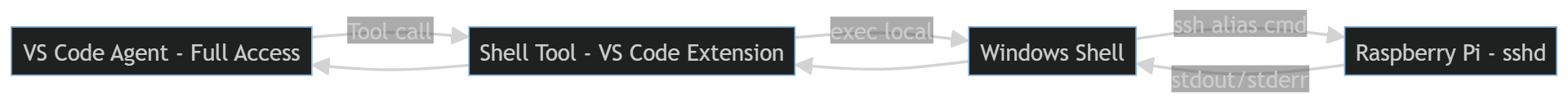 ```mermaid sequenceDiagram participant W as Windows participant P as Raspberry Pi W->>P: ping <PI_IP> W->>P: ssh <USER>@<PI_IP> "uname -a" W: ssh-keygen (clé dédiée sans passphrase) W->>P: installer la clé publique dans authorized_keys W->>P: ssh <ALIAS> "uname -a" (non-interactif) ```participant P as Raspberry Pi W->>P: ping <PI_IP> W->>P: ssh <USER>@<PI_IP> "uname -a" W->>W: ssh-keygen (clé dédiée sans passphrase) W->>P: installer la clé publique dans authorized_keys W->>P: ssh <ALIAS> "uname -a" (non-interactif) ```